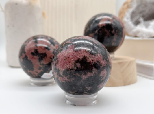 Kraftvolle Rhodonit Kugel inkl. Ständer