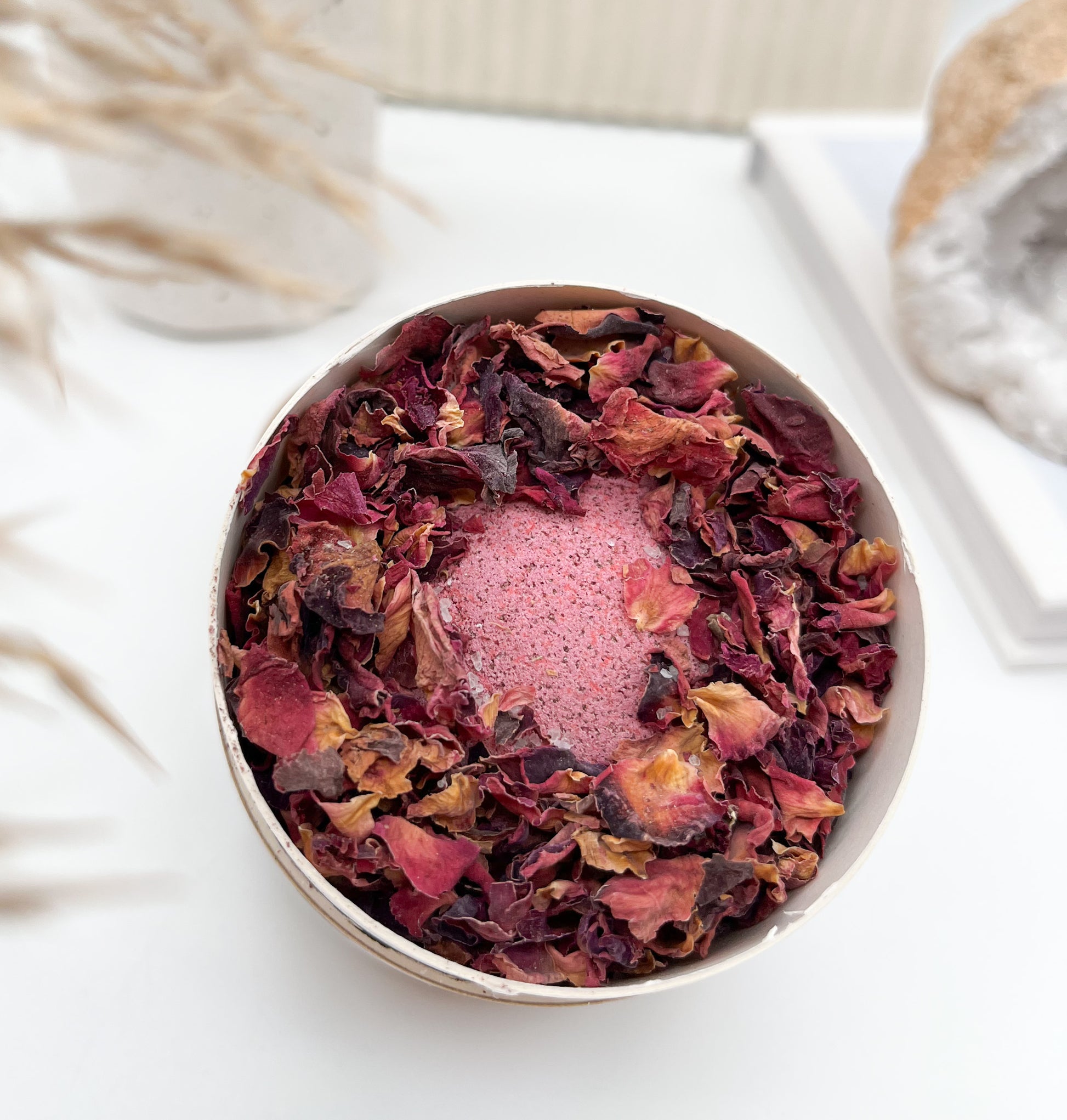 Badebombe mit der wunderbaren Kombination aus Ylang und Ingwer, mit getrockneten Rosenblüten und Himalaya-Salz