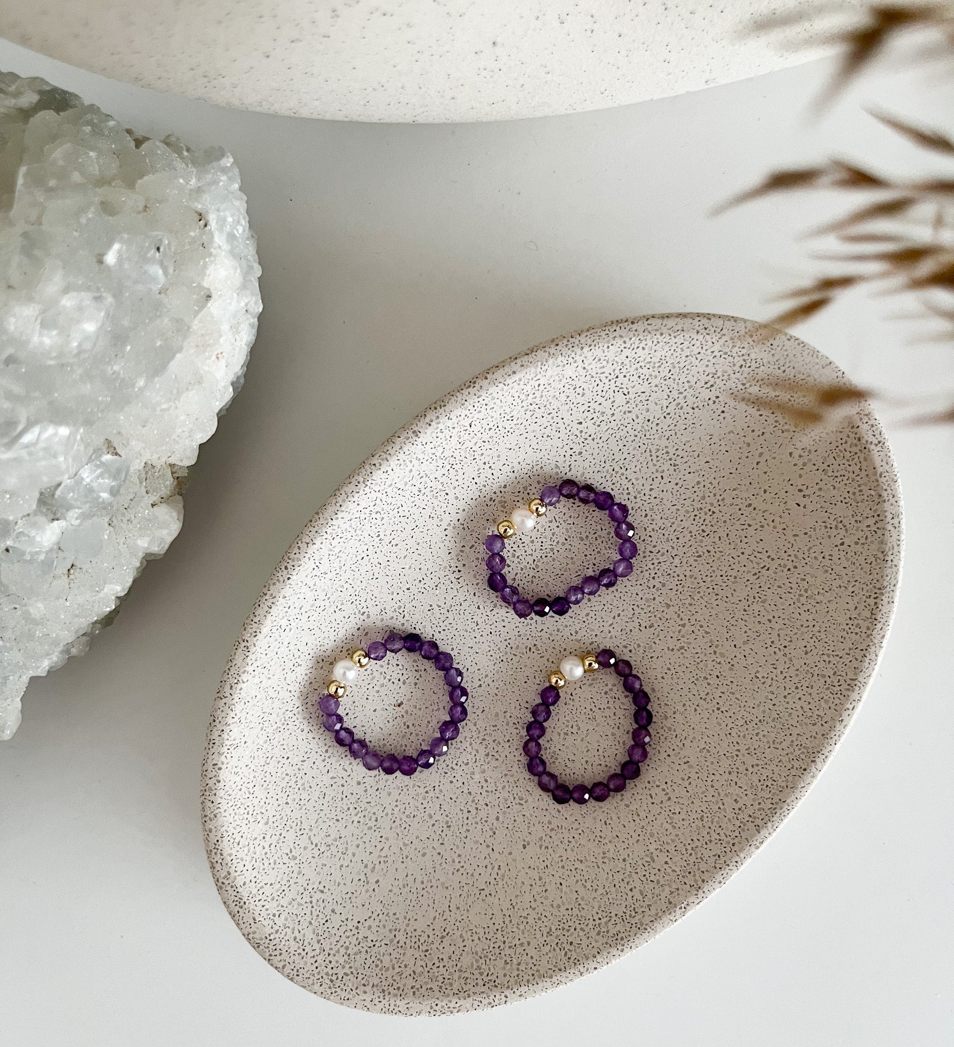 Sehr schöne Elastikringe in verschiedenen Steinsorten, 4mm facettiert, mit einer Süßwasserperle und goldfarbenen Kügelchen.